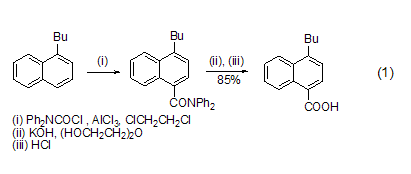羧基的引入 在AlCl3催化下,DPC-Cl 可在芳環(huán)上引入一個羧基。烷基或烷氧基取代的芳環(huán)容易發(fā)生反應(yīng)。產(chǎn)物二苯基酰胺用堿水解,再酸化可得到羧酸 (式1)[1]。