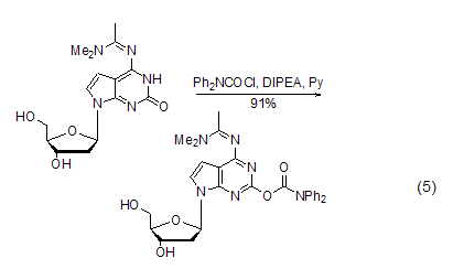 用作寡聚核苷酸合成時的保護基 在合成寡聚核苷酸時,鳥嘌呤核苷的堿基容易發(fā)生副反應(yīng),需要加以保護,DPC-Cl可以將鳥嘌呤堿基的烯醇異構(gòu)體酰基化而對其進行保護,這種方法在合成具有鳥嘌呤堿基和與鳥嘌呤堿基類似的核苷化合物時[9~12],發(fā)揮著重要作用 (式5)。