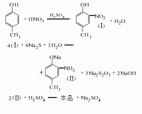 鄰硝基對(duì)甲苯酚用硫化堿或催化加氫還原而得。從對(duì)甲苯酚硝化出發(fā)原料消耗定額:對(duì)甲苯酚工業(yè)品963kg/t、硝酸(96%)661kg/t、硫酸(92.5%)2127kg/t、硫化堿(60%)2425kg/t、純堿20kg/t。